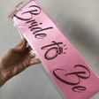 Рожева атласна стрічка через плече з коричневий буквене позначення Bride to be. Ширина стрічки: 9,2см. Довжина стрічки (складеної вдвічі): 78,5 див. Напис Bride to be тільки попереду (з одного боку).