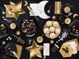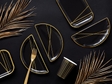 Чорні паперові стаканчики із золотими смугами. Ідеально виглядають з іншими товарами цієї колекції (тарілочки, серветки, банер).