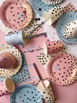 Блакитні паперові стаканчики в срібний фольгований горошок. Ідеально виглядають з іншими товарами цієї колекції (тарілочки, серветки, ковпачки, коробочки поп-корн).