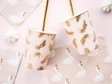 Паперові склянки ніжно-рожевого кольору із золотими пір'їнками. Ідеально виглядають з іншими товарами цієї колекції (тарілочки, серветки, трубочки, гірлянда, фото-бутафорія, топпери).