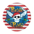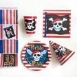 Паперові тарілочки з черепом. Виготовлені із міцного картону українською торговою маркою. Загальне тло виконано в смужку червоно-білого кольору. Буквене позначення Pirate і малюнок черепа з піратськими шаблями. Ідеально виглядають з іншими товарами цієї колекції (стаканчики, серветки, скатертина, ковпачки).